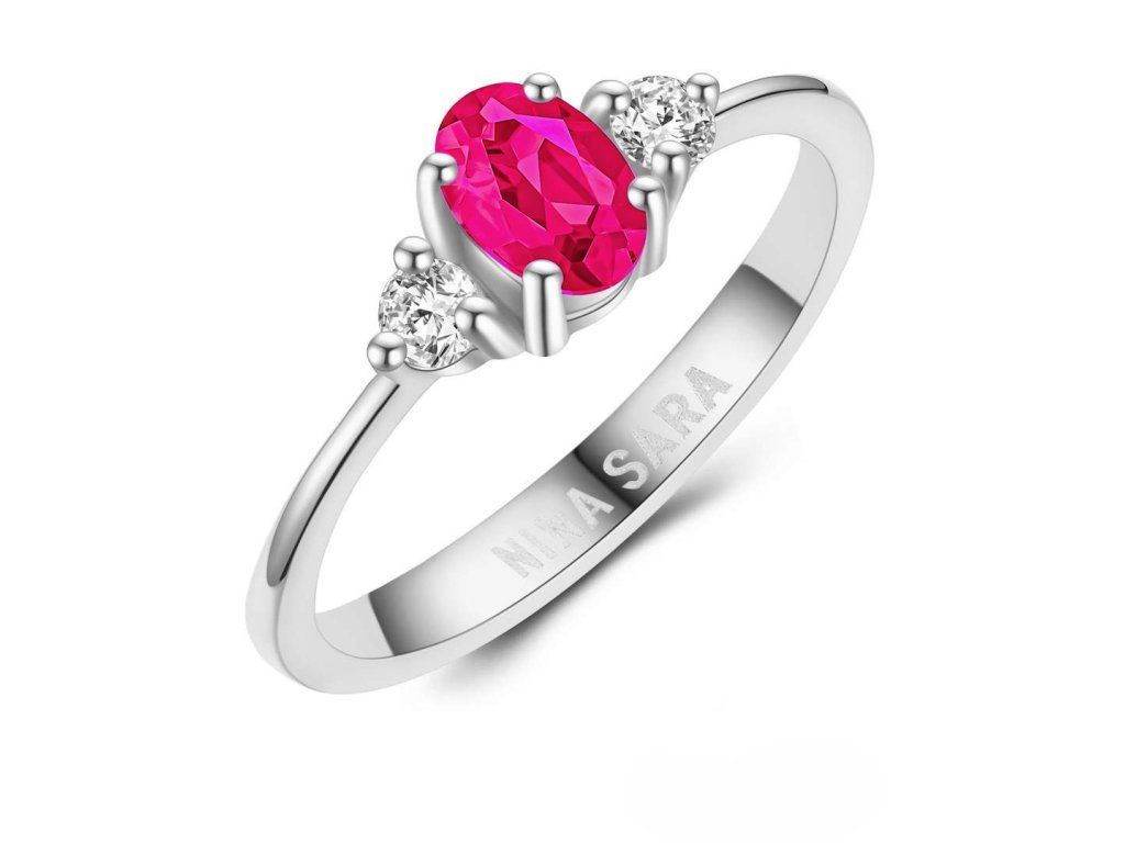 Dominantou prstenu je syntetický rubín s intenzivní červenou barvou, která symbolizuje harmonii, naději a nový začátek. Kámen je pečlivě zasazen tak, aby vynikla jeho hloubka, jas i přirozená kresba. Po jeho stranách jsou osazeny dva zirkony, jejichž čirost a brilantní brus dodávají prstenu oslnivý třpyt. Zirkony jemně zvýrazňují centrální rubín a vytvářejí vyváženou a harmonickou kompozici.