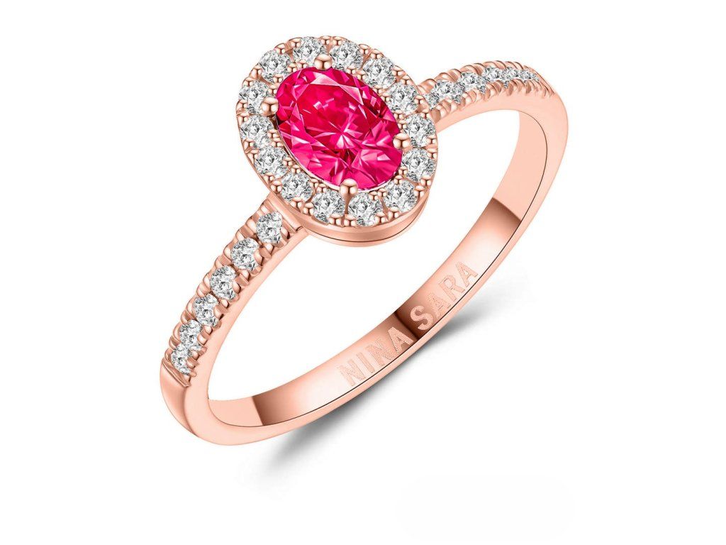 Dominantou prstenu je syntetický rubín s intenzivní červenou barvou, která symbolizuje harmonii, naději a nový začátek. Kámen je pečlivě zasazen tak, aby vynikla jeho hloubka, jas i přirozená kresba. Po jeho stranách jsou osazeny zirkony, jejichž čirost a brilantní brus dodávají prstenu oslnivý třpyt. Zirkony jemně zvýrazňují centrální rubín a vytvářejí vyváženou a harmonickou kompozici.