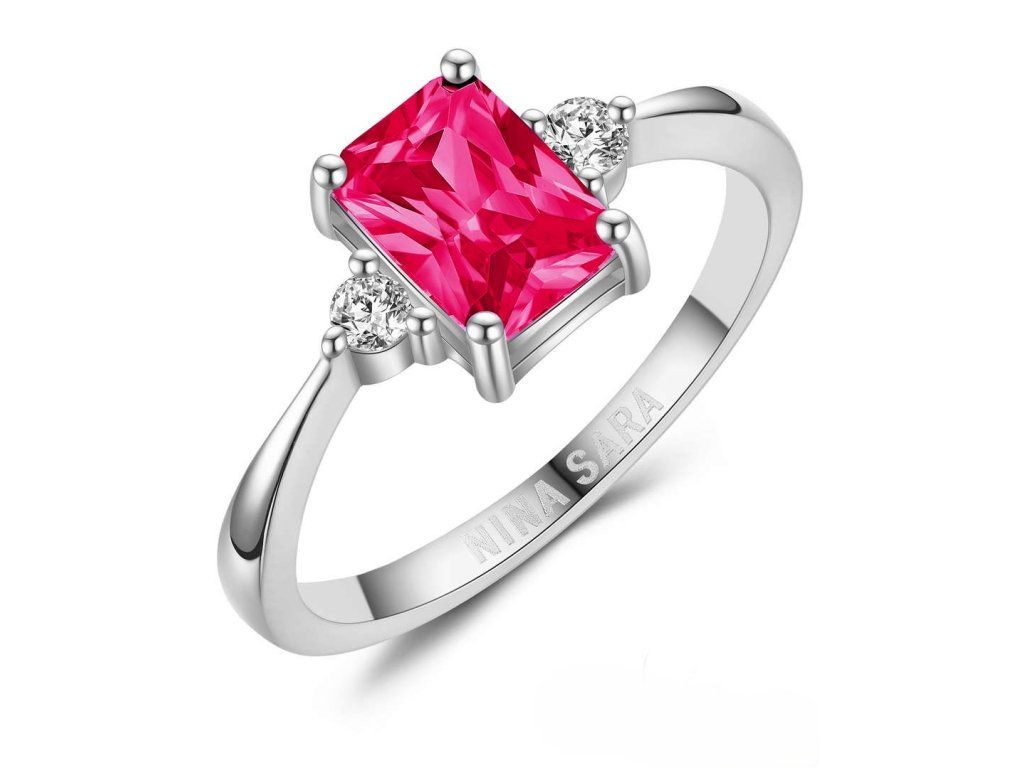 Dominantou prstenu je syntetický rubín s intenzivní červenou barvou, která symbolizuje harmonii, naději a nový začátek. Kámen je pečlivě zasazen tak, aby vynikla jeho hloubka, jas i přirozená kresba. Po jeho stranách jsou osazeny dva zirkony, jejichž čirost a brilantní brus dodávají prstenu oslnivý třpyt. Zirkony jemně zvýrazňují centrální rubín a vytvářejí vyváženou a harmonickou kompozici.