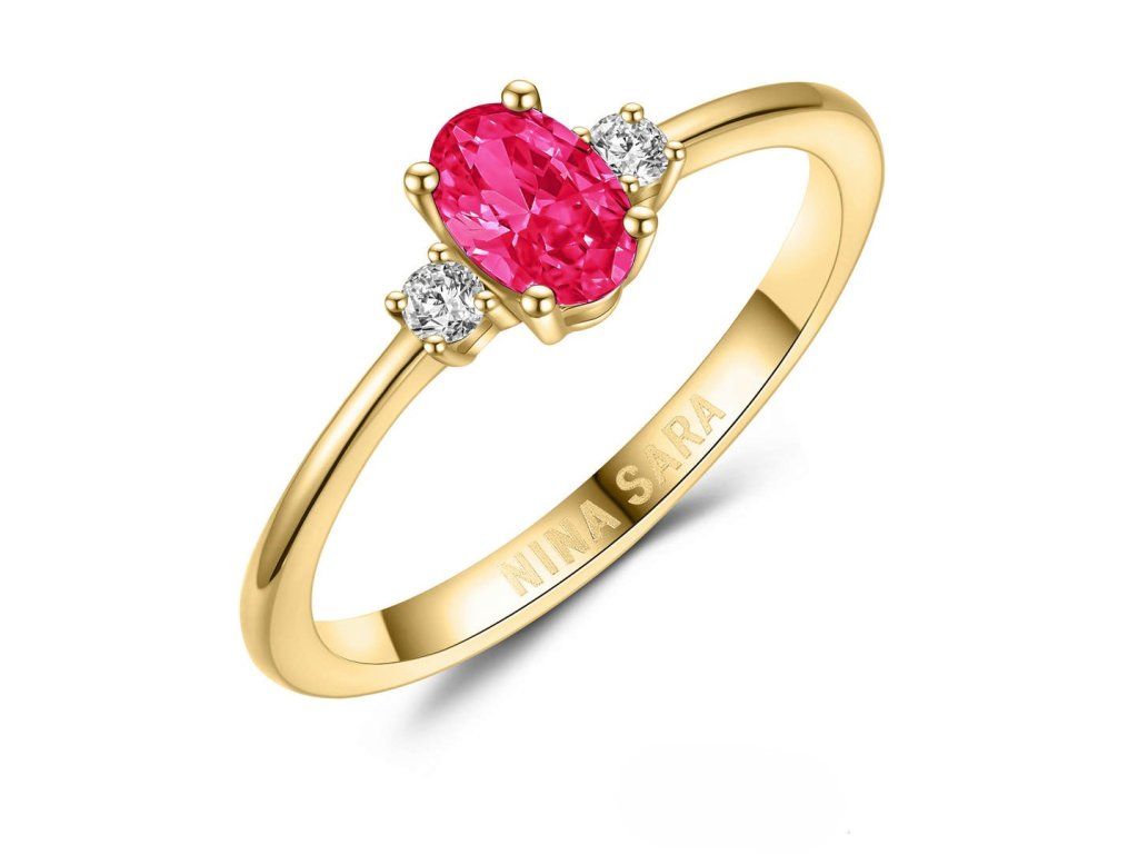 Dominantou prstenu je syntetický rubín s intenzivní červenou barvou, která symbolizuje harmonii, naději a nový začátek. Kámen je pečlivě zasazen tak, aby vynikla jeho hloubka, jas i přirozená kresba. Po jeho stranách jsou osazeny dva zirkony, jejichž čirost a brilantní brus dodávají prstenu oslnivý třpyt. Zirkony jemně zvýrazňují centrální rubín a vytvářejí vyváženou a harmonickou kompozici.