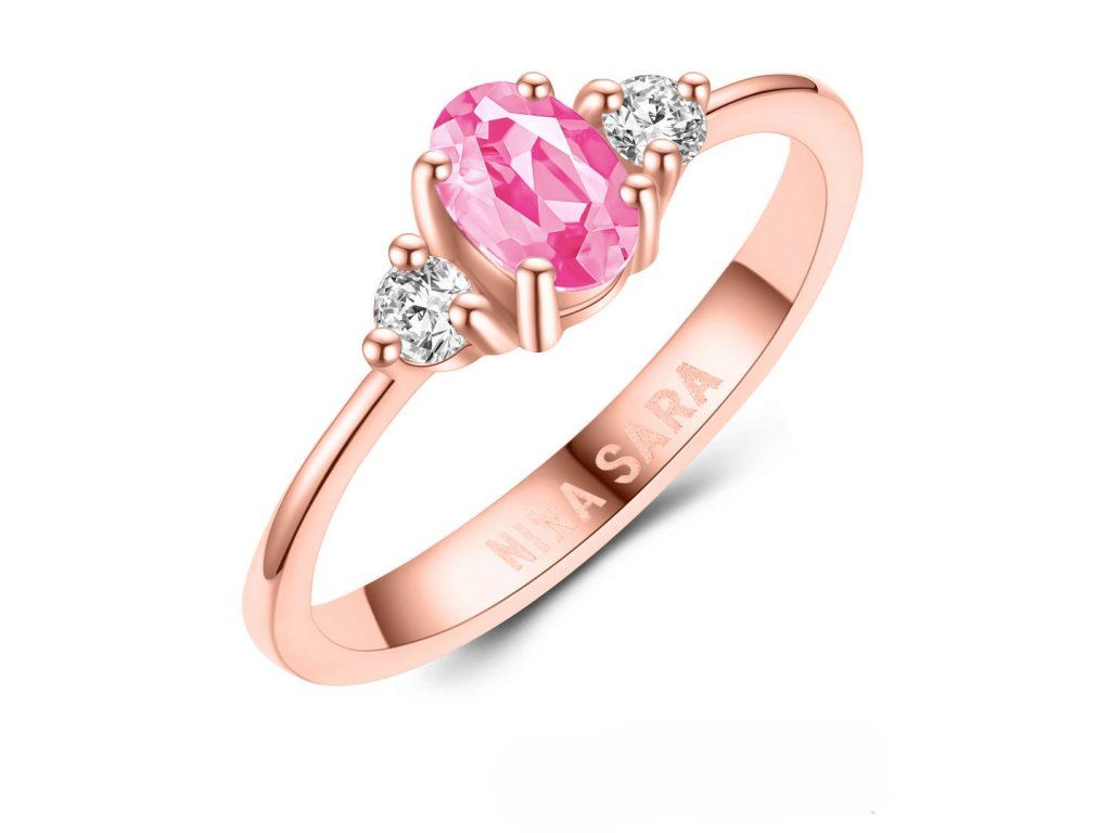 Dominantou prstenu je syntetický safír s intenzivní růžovou barvou, která symbolizuje harmonii, naději a nový začátek. Kámen je pečlivě zasazen tak, aby vynikla jeho hloubka, jas i přirozená kresba. Po jeho stranách jsou osazeny dva zirkony, jejichž čirost a brilantní brus dodávají prstenu oslnivý třpyt. Zirkony jemně zvýrazňují centrální růžový safír a vytvářejí vyváženou a harmonickou kompozici.