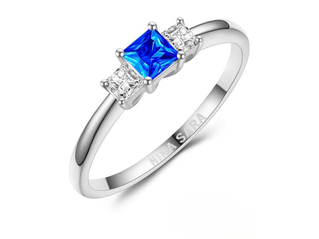 Dominantou prstenu je syntetický safír s intenzivní modrou barvou, která symbolizuje harmonii, naději a nový začátek. Kámen je pečlivě zasazen tak, aby vynikla jeho hloubka, jas i přirozená kresba. Po jeho stranách jsou osazeny dva zirkony, jejichž čirost a brilantní brus dodávají prstenu oslnivý třpyt. Zirkony jemně zvýrazňují centrální safír a vytvářejí vyváženou a harmonickou kompozici.
