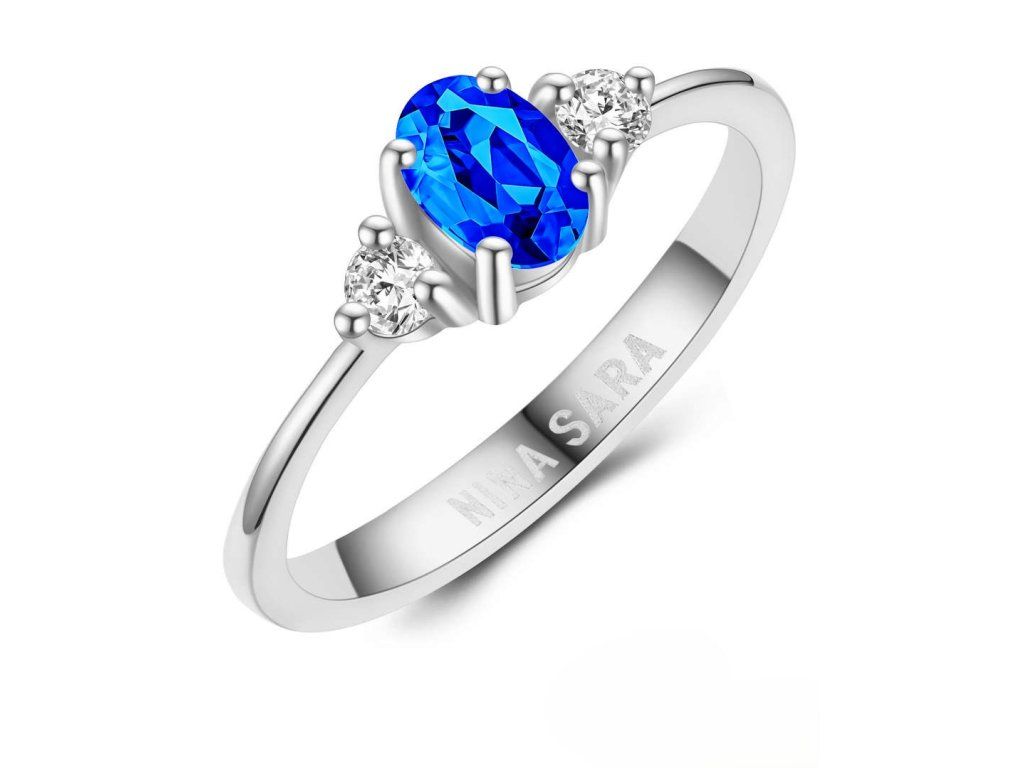 Dominantou prstenu je syntetický safír s intenzivní modrou barvou, která symbolizuje harmonii, naději a nový začátek. Kámen je pečlivě zasazen tak, aby vynikla jeho hloubka, jas i přirozená kresba. Po jeho stranách jsou osazeny dva zirkony, jejichž čirost a brilantní brus dodávají prstenu oslnivý třpyt. Zirkony jemně zvýrazňují centrální safír a vytvářejí vyváženou a harmonickou kompozici.