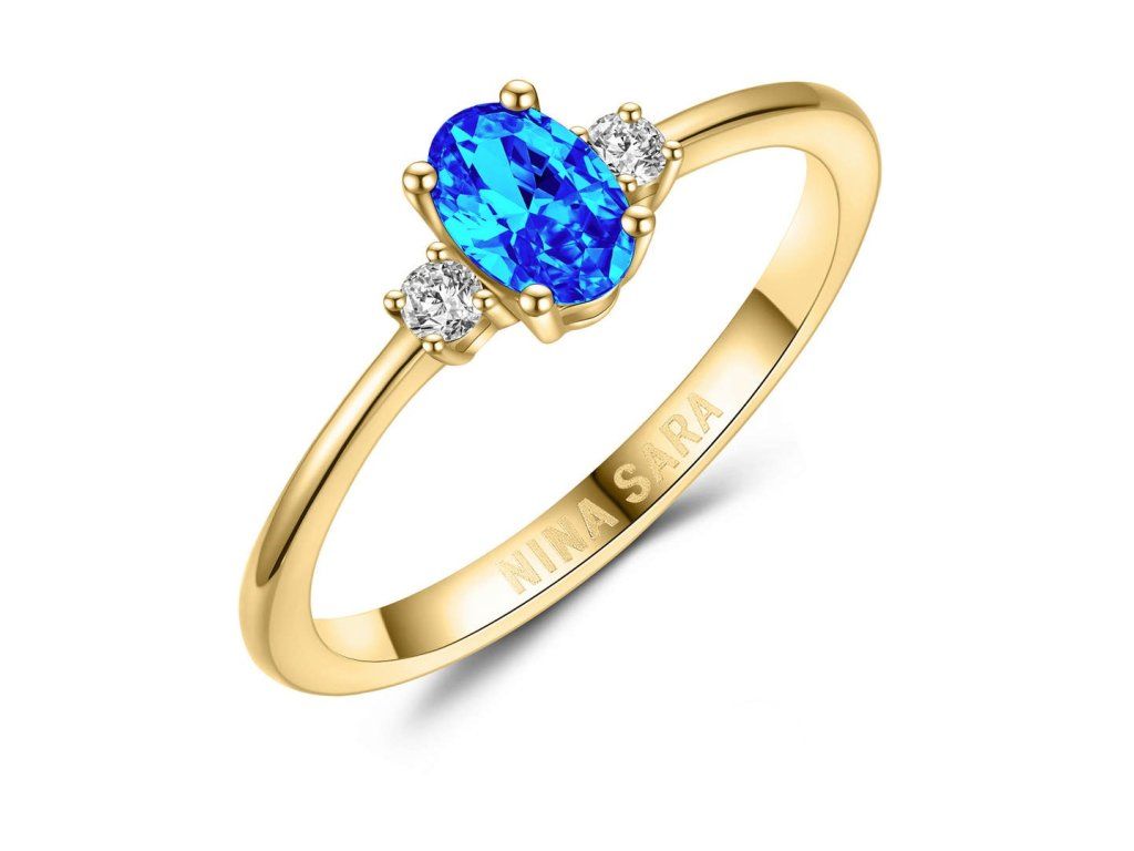 Dominantou prstenu je syntetický safír s intenzivní modrou barvou, která symbolizuje harmonii, naději a nový začátek. Kámen je pečlivě zasazen tak, aby vynikla jeho hloubka, jas i přirozená kresba. Po jeho stranách jsou osazeny dva zirkony, jejichž čirost a brilantní brus dodávají prstenu oslnivý třpyt. Zirkony jemně zvýrazňují centrální safír a vytvářejí vyváženou a harmonickou kompozici.
