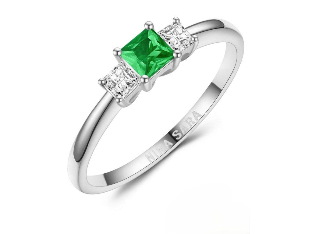 Dominantou prstenu je syntetický smaragd s intenzivní zelenou barvou, která symbolizuje harmonii, naději a nový začátek. Kámen je pečlivě zasazen tak, aby vynikla jeho hloubka, jas i přirozená kresba. Po jeho stranách jsou osazeny dva zirkony, jejichž čirost a brilantní brus dodávají prstenu oslnivý třpyt. Zirkony jemně zvýrazňují centrální smaragd a vytvářejí vyváženou a harmonickou kompozici.