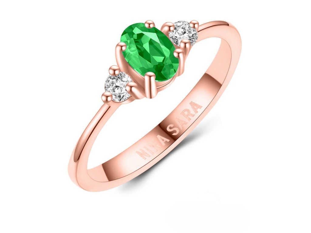 Dominantou prstenu je syntetický smaragd s intenzivní zelenou barvou, která symbolizuje harmonii, naději a nový začátek. Kámen je pečlivě zasazen tak, aby vynikla jeho hloubka, jas i přirozená kresba. Po jeho stranách jsou osazeny dva zirkony, jejichž čirost a brilantní brus dodávají prstenu oslnivý třpyt. Zirkony jemně zvýrazňují centrální smaragd a vytvářejí vyváženou a harmonickou kompozici.