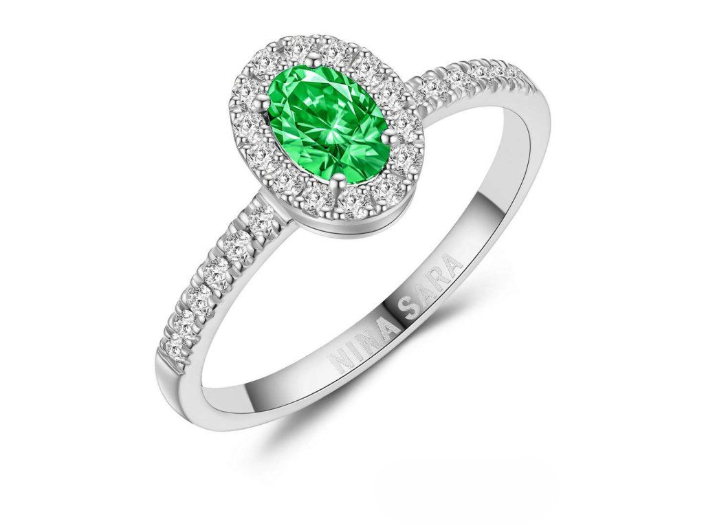 Dominantou prstenu je syntetický smaragd s intenzivní zelenou barvou, která symbolizuje harmonii, naději a nový začátek. Kámen je pečlivě zasazen tak, aby vynikla jeho hloubka, jas i přirozená kresba. Po jeho stranách jsou osazeny zirkony, jejichž čirost a brilantní brus dodávají prstenu oslnivý třpyt. Zirkony jemně zvýrazňují centrální smaragd a vytvářejí vyváženou a harmonickou kompozici.