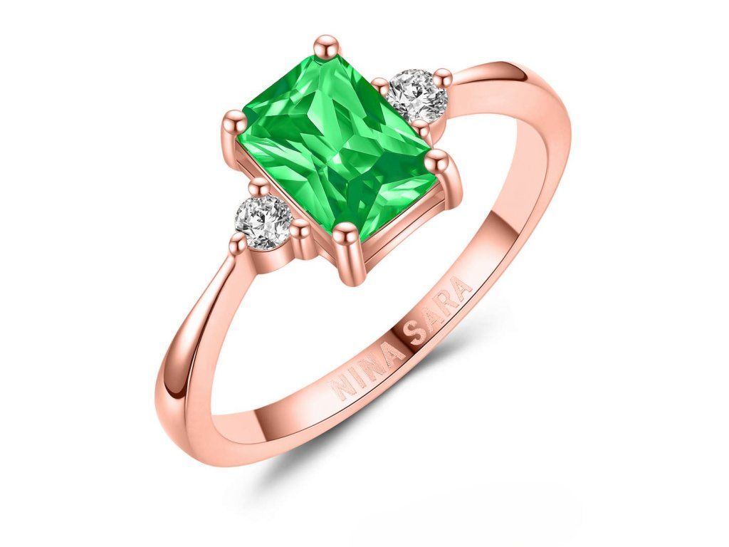 Dominantou prstenu je syntetický smaragd s intenzivní zelenou barvou, která symbolizuje harmonii, naději a nový začátek. Kámen je pečlivě zasazen tak, aby vynikla jeho hloubka, jas i přirozená kresba. Po jeho stranách jsou osazeny dva zirkony, jejichž čirost a brilantní brus dodávají prstenu oslnivý třpyt. Zirkony jemně zvýrazňují centrální smaragd a vytvářejí vyváženou a harmonickou kompozici.