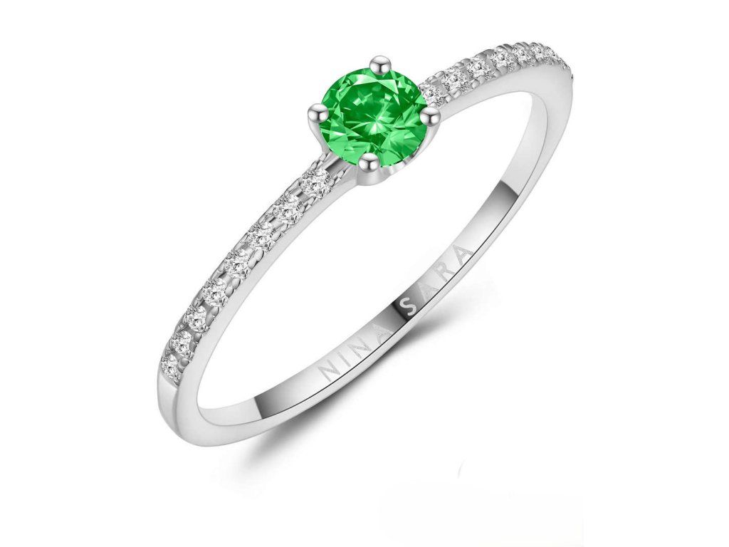 Dominantou prstenu je syntetický smaragd s intenzivní zelenou barvou, která symbolizuje harmonii, naději a nový začátek. Kámen je pečlivě zasazen tak, aby vynikla jeho hloubka, jas i přirozená kresba. Po jeho stranách jsou osazeny zirkony, jejichž čirost a brilantní brus dodávají prstenu oslnivý třpyt. Zirkony jemně zvýrazňují centrální smaragd a vytvářejí vyváženou a harmonickou kompozici.