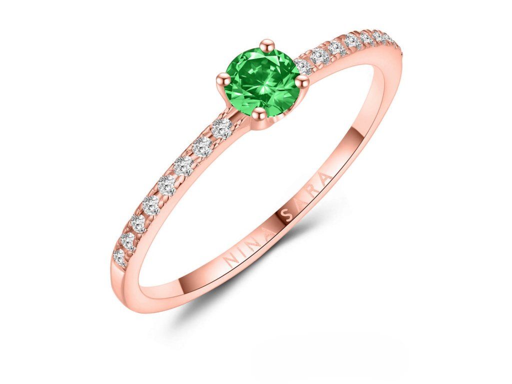 Dominantou prstenu je syntetický smaragd s intenzivní zelenou barvou, která symbolizuje harmonii, naději a nový začátek. Kámen je pečlivě zasazen tak, aby vynikla jeho hloubka, jas i přirozená kresba. Po jeho stranách jsou osazeny zirkony, jejichž čirost a brilantní brus dodávají prstenu oslnivý třpyt. Zirkony jemně zvýrazňují centrální smaragd a vytvářejí vyváženou a harmonickou kompozici.