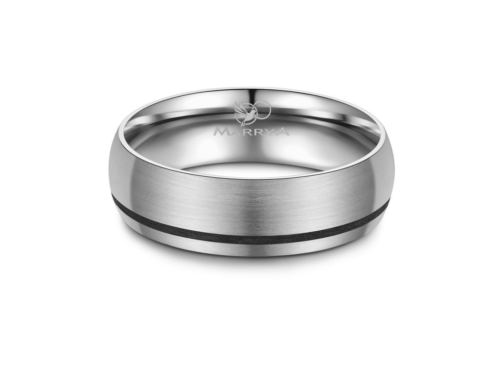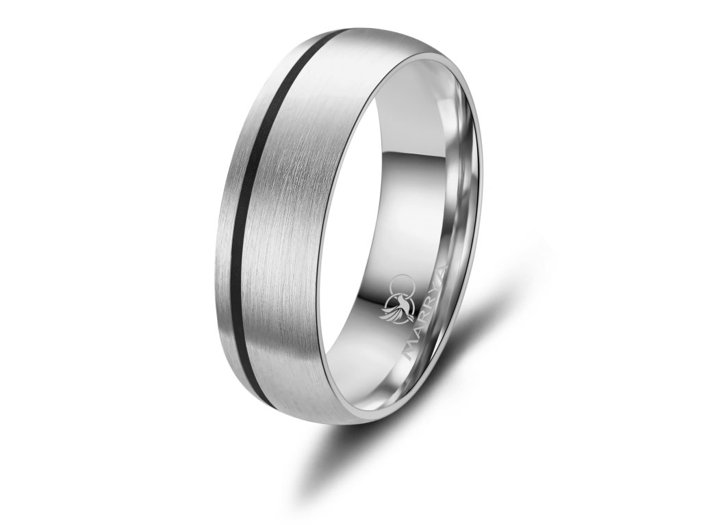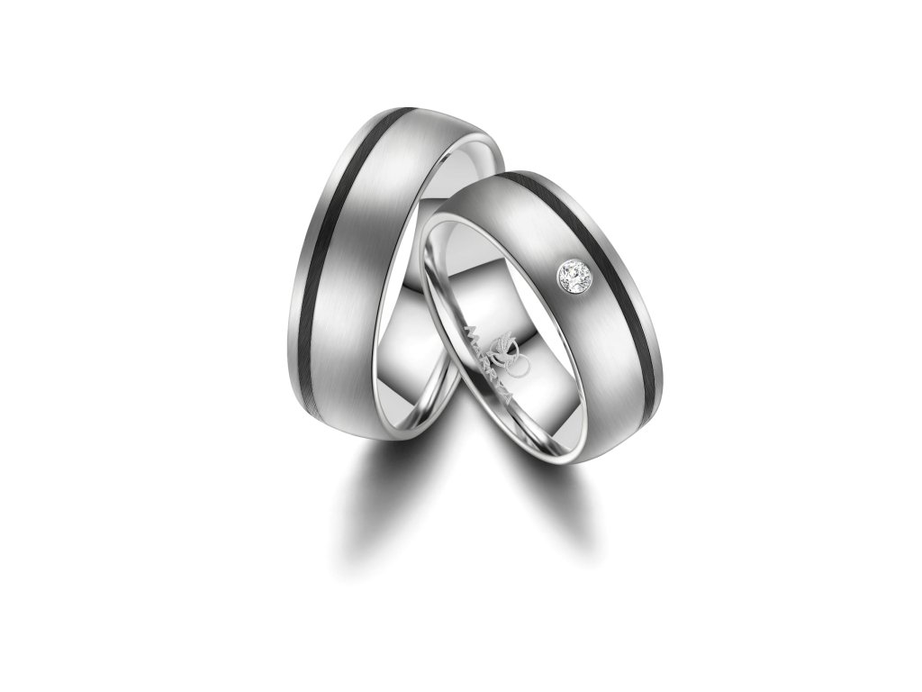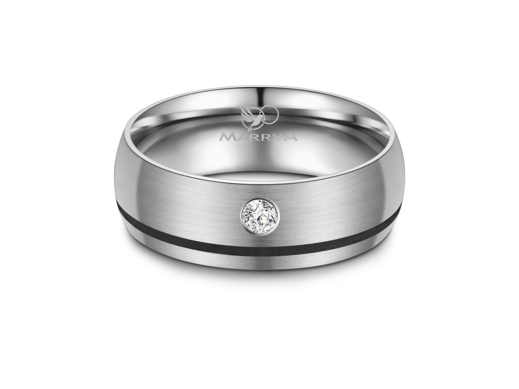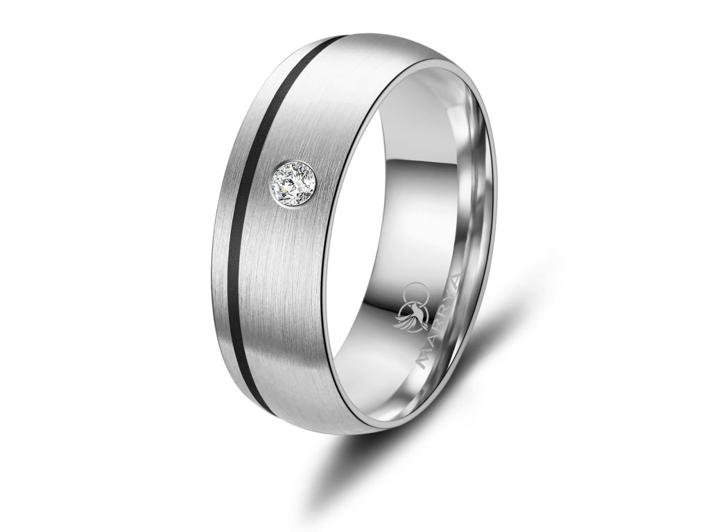 Prsteny mají komfortní vnitřní profil, který zajišťuje příjemné nošení po celý den. Povrch je precizně zpracovaný a doplněn o černý pruh, jenž působí elegantně a zároveň minimalizuje viditelnost drobných škrábanců. Dámský prsten je ozdoben zirkonem nebo diamantem, které dodávají šperku jemný třpyt a luxusní vzhled, zatímco pánský prsten zůstává čistý, jednoduchý a moderní.