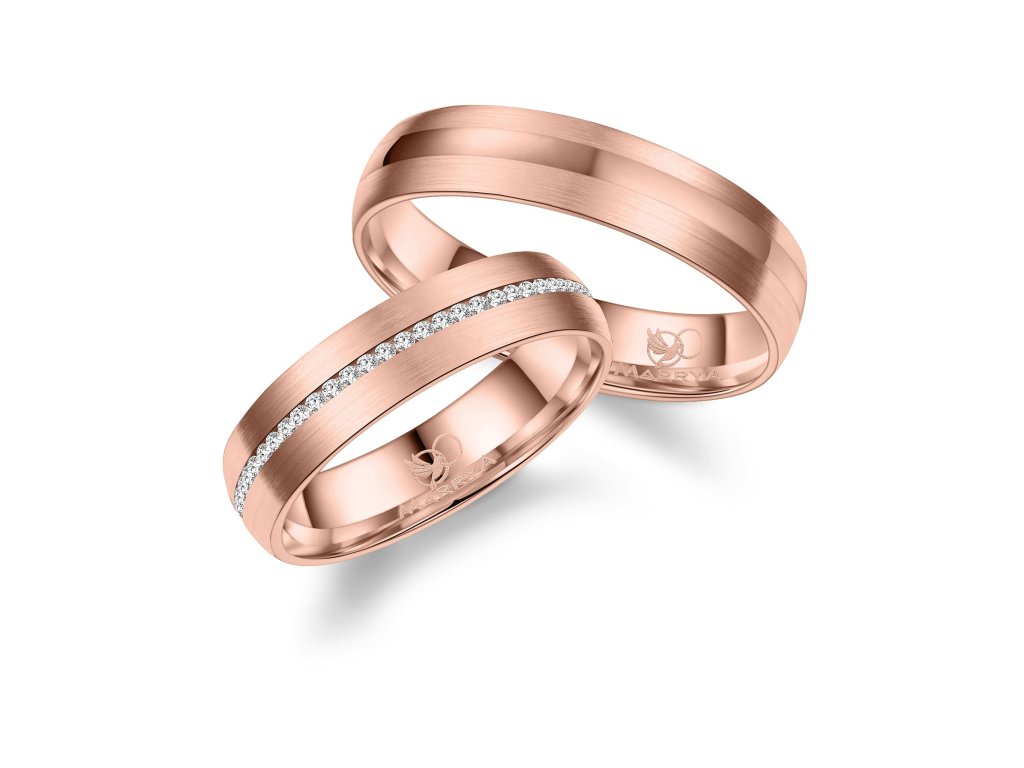 Prsteny mají komfortní vnitřní profil, který zajišťuje příjemné nošení po celý den. Povrch je precizně zpracovaný do jemně matovaného efektu se zlacenou povrchovou úpravou v červeném zlatě, jenž působí elegantně a zároveň minimalizuje viditelnost drobných škrábanců. Dámský prsten je ozdoben řadou kamínků, které dodávají šperku jemný třpyt a luxusní vzhled, zatímco pánský prsten zůstává čistý, jednoduchý a moderní.