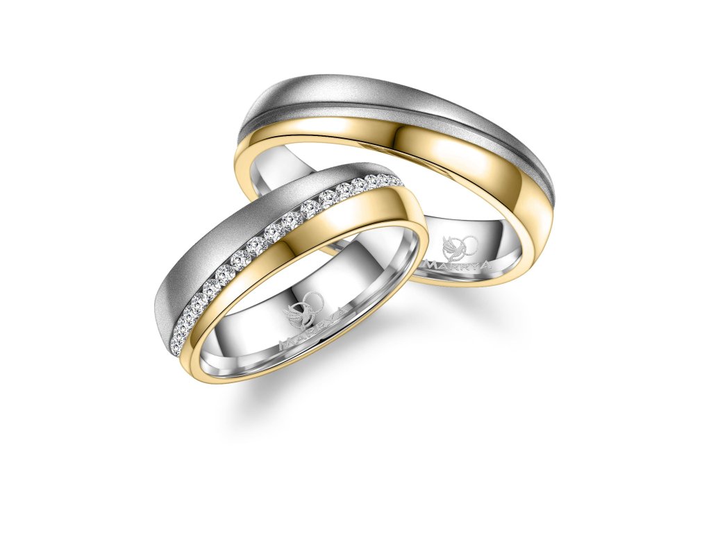 Prsteny mají komfortní vnitřní profil, který zajišťuje příjemné nošení po celý den. Povrch je precizně zpracovaný do jemně lesklého efektu s povrchovou úpravou ve žlutém zlatě, jenž působí elegantně a zároveň minimalizuje viditelnost drobných škrábanců. Dámský prsten je ozdoben řadou kamínků, které dodávají šperku jemný třpyt a luxusní vzhled, zatímco pánský prsten zůstává čistý, jednoduchý a moderní.