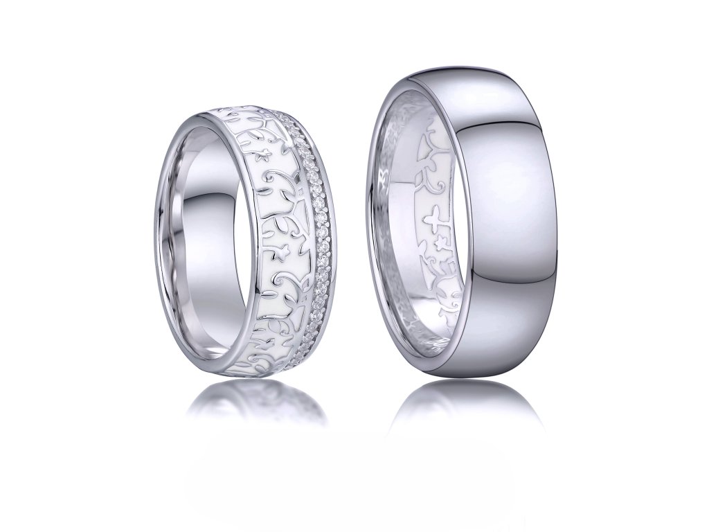 Dámský prsten zaujme bohatě propracovaným ornamentálním motivem, který je vyplněn kvalitním smaltem a vytváří působivý kontrast s lesklým povrchem stříbra. Po obvodu je doplněn řadou jemných třpytivých zirkonů, jež dodávají prstenu luxusní, romantický nádech a krásně odrážejí světlo při každém pohybu ruky. Pánský prsten je laděn do elegantního, hladkého designu s důrazem na jednoduchost a mužnost, přičemž ornamentální zdobení na vnitřní straně decentně navazuje na motiv dámského prstenu a vytváří harmonický celek.