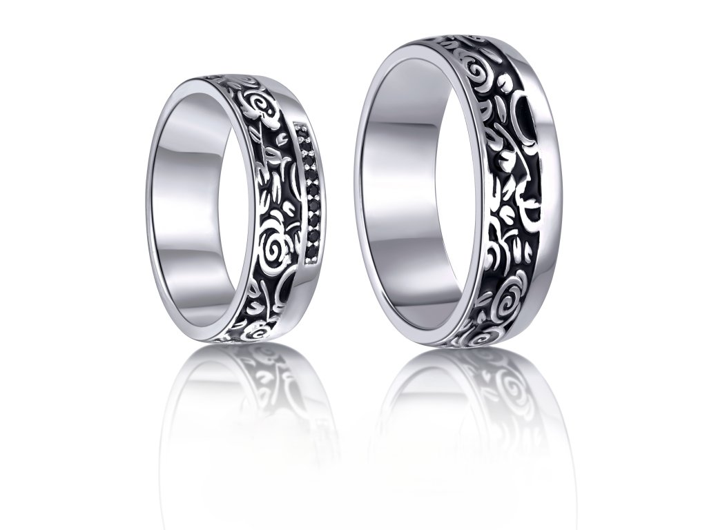 Dominantním prvkem obou prstenů je bohatý ornamentální vzor, zvýrazněný tmavým smaltem, který vytváří působivý kontrast s lesklým povrchem stříbra. Díky této kombinaci působí prsteny luxusně, výrazně a zároveň nadčasově. Dámský prsten je navíc ozdoben řadou jemných třpytivých kamínků, které dodávají šperku eleganci a decentní lesk, aniž by narušily celkovou harmonii designu. Pánský prsten zachovává čistý a vyvážený vzhled, který podtrhuje jeho mužnost a styl.
