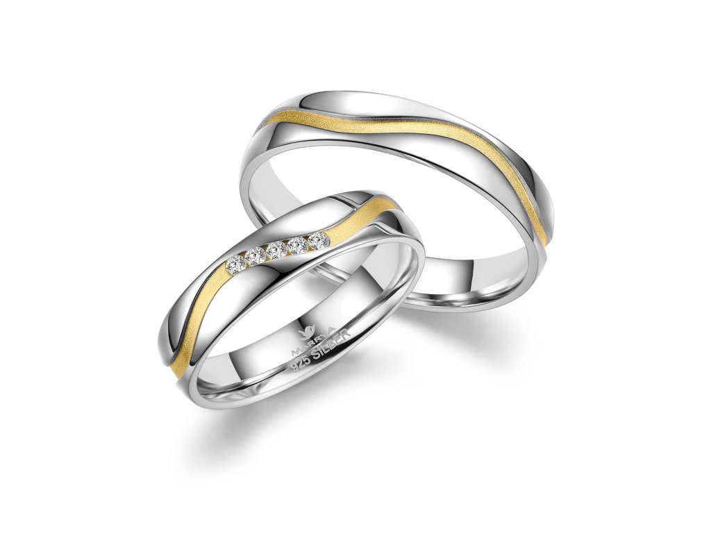 Tyto snubní prsteny ze stříbra mají klasický půlkulatý tvar a vysoce lesklý povrch doplněny o zlacený vzor, který podtrhuje jejich nadčasový a elegantní vzhled. Díky jednoduchému profilu jsou pohodlné pro každodenní nošení a snadno se kombinují s dalšími šperky. Dámský prsten je ozdoben kubickými zirkony, jenž dodává šperku jemný třpyt a luxusní detail, aniž by narušoval minimalistický desing. Šířka prstenu 4,5 mm představuje ideální rovnováhu mezi jemností a výrazností. Tyto stříbrné snubní prsteny jsou symbolem lásky a závazku a jsou vhodnou volbou pro páry hledající elegantní, cenově dostupné a nadčasové snubní prsteny. Snubní prsteny s rytinou jsou zbožím upraveným na míru, u kterého nelze dle § 1837 občanského zákoníku uplatnit vrácení ve lhůtě 14 dnů nebo odstoupení od smlouvy.