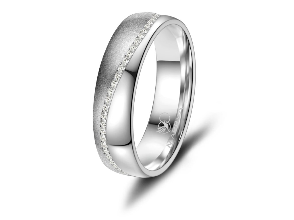 Tyto snubní prsteny ze stříbra mají exkluzivní půlkulatý tvar a vysoce lesklý povrch s matným částí, který podtrhuje jejich nadčasový a elegantní vzhled. Díky jednoduchému profilu jsou pohodlné pro každodenní nošení a snadno se kombinují s dalšími šperky. Dámský prsten je ozdoben j kubickými zirkony po celé obvodové části, jenž dodává šperku jemný třpyt a luxusní detail, aniž by narušoval minimalistický desing. Šířka prstenu 5,5 mm představuje ideální rovnováhu mezi jemností a výrazností. Tyto stříbrné snubní prsteny jsou symbolem lásky a závazku a jsou vhodnou volbou pro páry hledající elegantní, cenově dostupné a nadčasové snubní prsteny. Snubní prsteny s rytinou jsou zbožím upraveným na míru, u kterého nelze dle § 1837 občanského zákoníku uplatnit vrácení ve lhůtě 14 dnů nebo odstoupení od smlouvy.